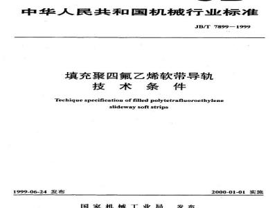 JB/T 7899-1999 本标准是对 JB/T 7899-95《填充聚四氟乙烯软带导轨 技术条件》的修订。 本标准规定了粘结填充聚四氟乙烯软带导轨的材料,设计,粘接,加工装配的技术要求。 本标准适用于金属切削机床和测量仪器的软带导轨。其它机械的软带导轨亦应参照使用。 本标准于 1989 年以 GB 10905-89 首次发布,于 1996 年 4 月 14 日调整为 JB/T 7899-95。 JB/T 7899-1999 填充聚四氟乙烯软带导轨 技术条件 JB/T7899-1999 标准下载解压密码:www.bzxz.net