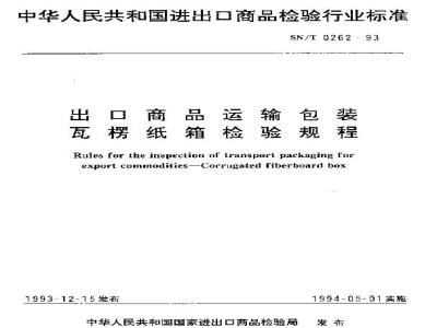 本标准规定了出口商品运输包装瓦楞纸箱的技术要求、检验项目、抽样与检验方法。本标准适用于海运、陆运及空运出口商品包装用单瓦楞、双瓦楞纸箱(简称瓦楞纸箱)的检验。 SN/T 0262-1993 出口商品运输包装瓦楞纸箱检验规程 SN/T0262-1993 标准下载解压密码:www.bzxz.net
