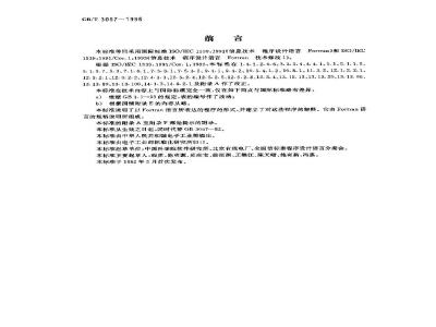 本标准等同采用国际标准ISO/IEC1539:1991《信息技术程序设计语言Fortran》和1SO/IEC1539:1991/Cor.1,1993信息技术程序设计语言Fortran技术修改1》。根据1SO/IEC1539:1991/Cor.1:1993,本标准在1.4.1.2-4.6.3.3.2.4,4.4.1、5.1,5-1.1-5、5. 1. 1. 7、5. 3、7. 1. 6. 1、7. 5- 3. 1、7. 5. 3. 2、9. 4. 1, 9. 4 2, 10. 5. 4. 1. 2、10. 8. 1,11. 3. 2、12. 1. 2. 2. 1.12. 3-2.1、12. 3. 2.2,12, 4. 1.1、12. 5. 2.4,12. 5. 2. 5、12. 5.2.8.12. 5. 4、13. 13. 13、13.13.25、13. 13. 66.13.13.80,13.13.100,14.1.3.14.6.2.1及附录A作了改正。本标准在技术内容上与国际标准完全致,仅在如下两点与国际标准略有差异,a)根据GB1.1-93的规定,表的编号作了改动,b)根据国情附录E的内容从略。本标准说明了以Fortran 语言所表达的程序的形式,并建立了对这些程序的解释。它由Fortran 语言的规格说明所组成。
