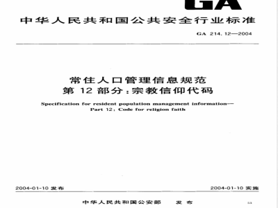 本部分规定了公民宗教信仰的代码。本部分适用于各级公安机关人口管理工作。 GA 214.12-2004 常住人口管理信息规范 第12部分:宗教信仰代码 GA214.12-2004 标准下载解压密码:www.bzxz.net