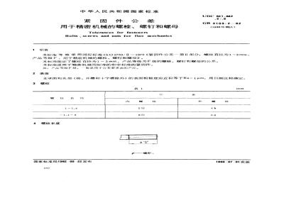 本标准等效采用国际标准ISO4759/ⅡI1979《紧固件公差一第Ⅱ部分:螺纹直径为1~3mm、产品等级F、用于精密机械的螺栓、螺钉和螺母》。本标准规定了螺纹直径为1~3mm、产品等级为F级的螺栓、螺钉和螺母的公差。本标准适用于精密机械用标准的和非标准的紧固件。注:产品等级F级,般适用于公差要求高的产品。2表面