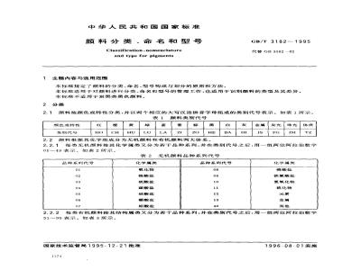本标准规定了颜料的分类、命名、型号构成与划分的原则和方法。GB/T 3182—1995
