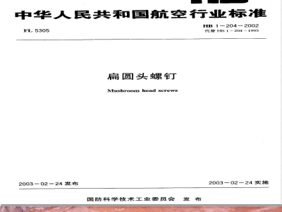 本标准代替HB1-204-1995《扁圆头螺钉》,HB1-204-1995限制使用。本标准主要修订内容:将30CrMnSiA材料的限用直径(4~8)mm改为(3~8)mm。本标准由中国航空工业第二集团公司提出。本标准由中国航空综合技术研究所归口。本标准起草单位:中国航空综合技术研究所和3117厂。本标准主要起草人:隋明丽、李丕智、何英、谷云辉。HB1-204-2002