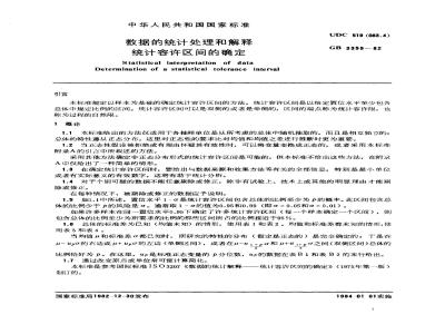 在每种情况下,被剔除或修正的数据应予说明。1.5如1.1中所述,置信水平1-α是统计容许区间包含总体的比例至少为P的概率。此区间包含总体的比例少于p的风险是α。通常取1-α的值为0.95和0.99(即α=0.05和α=0.01)。如果许多样本在同一置信水平0.95下确定了许多统计容许区间(每一个样本确定一个区间),则包含总体的比例至少为所要求的比例的那些区间所占的比例接近于95%。1.6总体的标准差为已知(均值未知)的情形,使用表1和表2。均值和标准差都未知的情形,使用表3和表4。