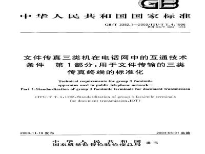 GB/T 3382.1—2003/ITU-T T.4: 1996文件传真三类机的国家标准GB/T3382已经实施20年,它对我国传真三类机的应用和发展起到了重要的指导作用。GB/T3382依据ITU-T(国际电信联盟-电信标准化部门)建议T.4《用于文件传输的三类传真终端的标准化》和T.30《在公用电话交换网上的文件传真传输规程》制定的。随着传真通信技术的发展,ITU-T对建议T.4和T.30进行了大幅度的修改和扩充,删除了在实际使用中证明无应用价值的技术内容,同时增加了各种新的技术要求。目前,新型的传真机中已经普遍实际应用了这些新技术,因此,重新修订GB/T3382,增加新的技术内容,使之适应技术发展和应用要求。本部分是修订后的GB/T3382.的第1部分,对应于ITU-T建议T.4。I范围