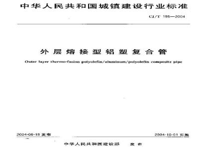 本标准于2004年8月18日首次发布。本标准为第一次制定。本标准主要参考国家标准GB/T 18997.1 -2003《铝塑复合压力管第1部分:铝管搭接焊式铝塑管》,GB/T 18742-2002《冷热水用聚丙烯管道系统》,GB/T 13663-2000《给水用聚乙烯(PE)管材》及城镇建设行业标准CJ/T 175-2002《冷热水用耐热聚乙烯(PE-RT)管道系统》等标准编写。本标准规定了由搭接焊铝管作为嵌入金属层增强,通过共挤热熔粘合剂与内层聚丙烯或聚乙烯、外层聚丙烯塑料复合而成的外层熔接型铝塑复合压力管的定义、符号、缩略语、分类标记、材料、要求、试验方法、检验规则和标志、使用说明书、包装、运输、贮存。本标准适用于冷热水管道系统,包括工业及民用冷热水、饮用水和热水采暖系统等。本标准不适用于灭火系统和非水介质的流体输送系统。 CJ/T 195-2004 外层熔接型铝塑复合管 CJ/T195-2004 标准下载解压密码:www.bzxz.net