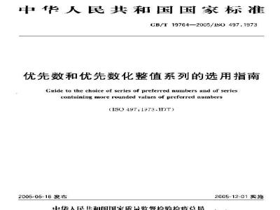 GB/T19764—2005/1S0)497,1973优先数和优先数化整值系列的选用指南本标准规定了充产使月的优先数准一-化披值,用修E量范人,小分为购个化整怕系列,本标准款适了应用这查化快位的条件而采用的结果,本标准给出了在优先微和各钟化常值之间止确选用的规则本款准适用于在患实际情况而不能采用优先数时,尽1S017关于效需选用和化整值虚用条件扩补死指导,
