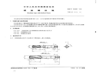 本标准规定了螺旋槽丝锥的型式尺寸、技术要求、性能试验和标志包装的基本要求。本标准适用于加工普通螺纹的机用螺旋槽丝锥,这种丝锥通常用于在韧性金属制件上对盲孔或断续表面孔的攻丝,丝锥螺纹精度按H1、H2、H3三种公差带制造。 GB/T 3506-1993 螺旋槽丝锥 GB/T3506-1993 标准下载解压密码:www.bzxz.net