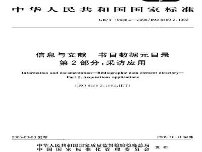 本部分规定和描述书目资料采访过程中机构之间数据交换所需的数据,也标识用于采访过程的消息及其数据。本部分用于两类消息,一类是用特定数据名称作为标题的打印好的表格传送的消息,另一类是通过自动化信息交换过程传送的消息。本部分不包含怎样将数据构造成为消息。 GB/T 19688.2-2005 信息与文献 书目数据目录 第2部分:采访应用 GB/T19688.2-2005 标准下载解压密码:www.bzxz.net