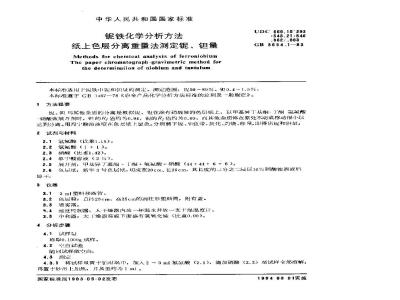 锯,与其他杂质的分离是根据钯、但在涂有硝酸铵的色层纸上,以甲基异丁基酮一「酮氢氟酸-硝酸做展斤剂时,钒的R值约为0.94,锯的R,值约为0.60,而其他杂质停在原处不动或移动很小以达到分离。用丹酸溶波在免层纸上显色。分别剪下铌、色带,灰化、灼烧、称鼠,即得出琵和钳鼠。2试剂与材料