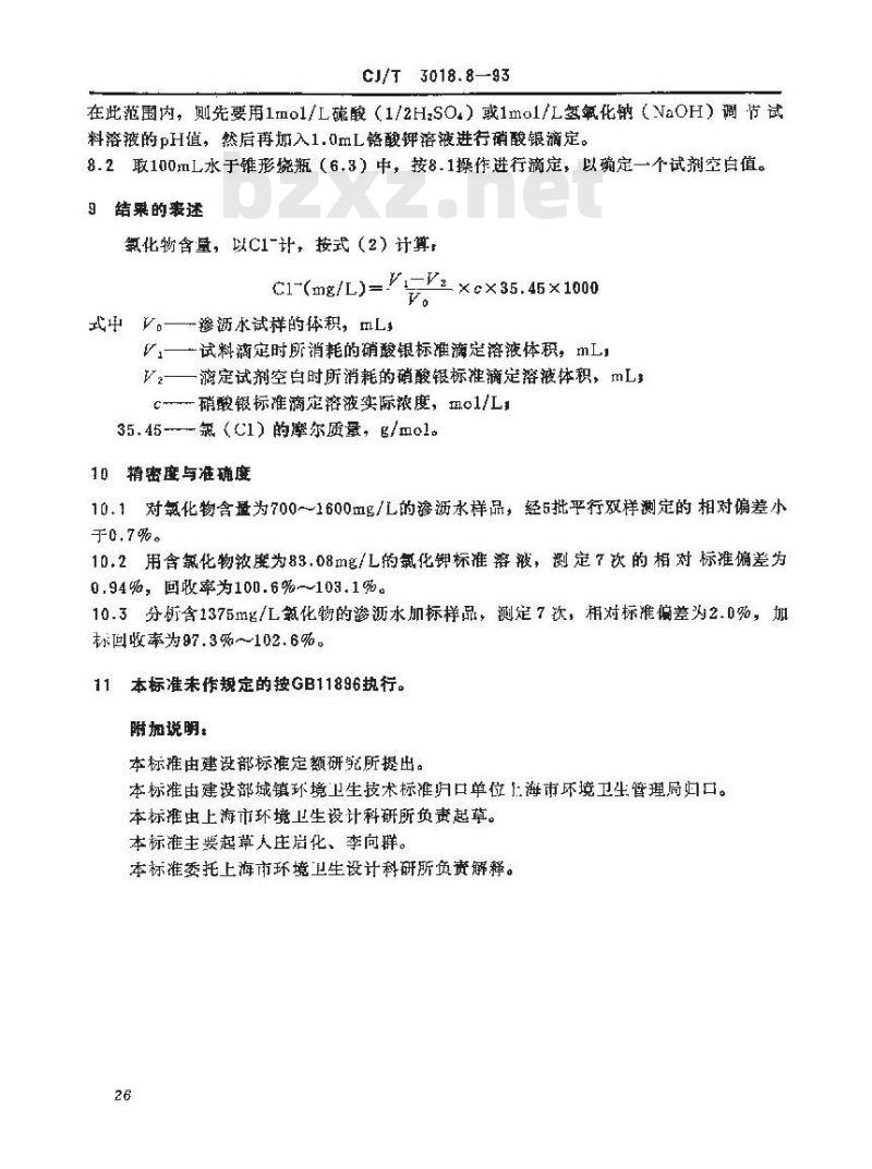 10.2用含氯化物救度为83.08mg/L的氯化钾标准溶液,测定7次的相对标准偏差为0.94%,回收率为100.6%~103.1%。10.3分析含13751m名/L氧化物的渗沥水加标样品,测定7次,箱对标准偏差为2.0始,加称问收率为97.3两~102.6%。