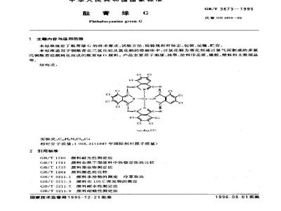 本标准规定了酸菁绿G的技术要求、试验方法、检验规则和标志、包装、运输、贮存。本标推适用于铜酰菁在三氟化铝及氯化钠的熔融体中,以氯化铜为催化剂通以氯气而制成的多氯代铜酷菁经颜料化而成的酸菁绿(颜料。产品主要用于油漆、油墨、涂料印花浆、橡胶、塑料和文教用品等。