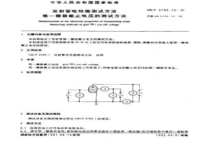 6.1按规范加上灯丝电压和各极电压。6.2调节第一栅极负电压,使阳极电流达到零或接近于零的某一规定值(在详细规范中规定),读取第国家技术监督局1991-08-15批准1992-04-01实施