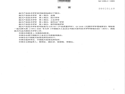 航天产品技术评审系列标准包括以下部分:航天产品技术评审第1部分:总则航天产品技术评审第2部分:设计评审航天产品技术评审第3部分:工艺评审航天产品技术评审第4部分:型号出厂评审航天产品技术评审第5部分:型号转场评审QJ 1302.1-2001