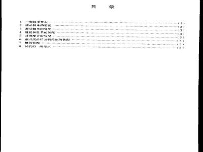 1.13光制螺栓孔(铰孔)和螺纹孔的中心线对机件的接触面的垂配度偏差不大了0.5:100。1.14螺栓装配后。其未端应伸鼎螺母端面2~51(t为螺距).1.15圆柱销或圆键销装配后,应使其与机件上的孔均匀接触,销的两端伸出的长度成恭本相等。用于盲孔时,允许开排气摊、孔。1.16各机件上的紧闹均应紧固、不得有松动现象。1.17所有回转零件。当Q·nmx>25吋。均诺进行静平衡试验,静平衡试验的具体要求应在图样中规定。当nmx≤20r/min时,可不做静平衡试验。Q为回转零的更或。单位为((吨);nm在x为回转零件的最大转速,单位为r/min(转/分)。1.18装配前应编制出合理的装配T艺规程,基本内穿包括:a.确定机器产品和部件的装配顺序和方法,确定试车方案,b,确定各单元的装配T.序内容和装配规范;C.选择所露的工具、夹具和设备:d.确定产品各组成部分装配和总装配的各道工序的技术条件:e.选择装配质量技术检验的方法和用具:f.包装前需要解体时必须打十不易消失的标记,选择运输工具。2滚动轴承的装配