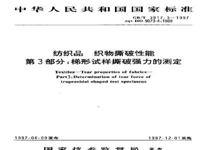 标准自实施之白起,向时代好心3918—53幼织品纸物撕破生够包括三个部分:第1部分斯破强为的测定冲击据锤法:第2部分:舌形试样斯碳业力的定;弟1部分,榜形试样两能强力的定,本标准由中国织总会科技发殿部提出,本标准功中国纺织总会标化研究所口,本标准起草单位,上海市纺织科学研究院。本标难主要起草人:麦家俊、陈洁,吴岚。fR/T3917.3—1997
