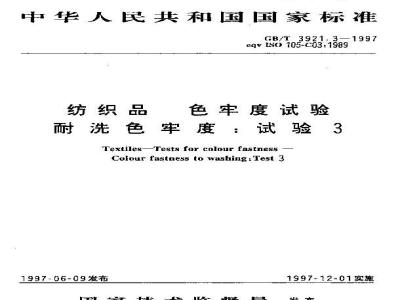 本标准规定了五种耐洗色牢度试验系列中的第3种试验,已定为研究有色纺织品的耐洗色牢度试验方法。本系列试验中包括从温和到剧烈的洗涤操作范围。 GB/T 3921.3-1997 纺织品 色牢度试验 耐洗色牢度:试验3 GB/T3921.3-1997 标准下载解压密码:www.bzxz.net