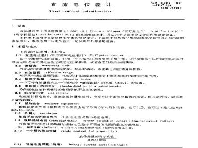 本标准适用于准确度等级为0.0001~0.1〔1ppm~1000ppm(百万分之几)1×106~1×103(科学标记法scientific notation)〕的直流电位差计,并适用于上述电位差计的内附辅助设备。本标准不适用于自动获得零平衡的电位差计,不适用于那些借平衡检测器刻度获得部分指示值的电位差计,也不适用于与电位差计一起使用的外部辅助设备。 GB/T 3927-1983 直流电位差计 GB/T3927-1983 标准下载解压密码:www.bzxz.net