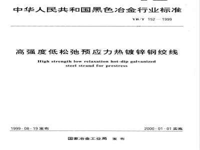 本标准规定了高强度低松弛预应力镀锌钢绞线的几何尺寸、重量、技术要求、试验方法、检验规则、包装、标志和质f证明书等。 YB/T 152-1999 高强度低松弛预应力热镀锌钢绞线 YB/T152-1999 标准下载解压密码:www.bzxz.net