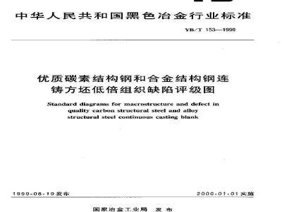 本标准规定了优质碳素结构钢合合金结构钢连铸方(矩形)坯及圆坯(以下简称连铸坯)的低倍组织缺陷形貌特征、产生原因和评级原则。本标准适用于评定优质碳素结构钢、合金结构钢、弹簧钢等连铸坯的横截面酸蚀低倍组织缺陷。连铸坯尺寸范围为:100~300mm的方或矩形坯,90~350mm圆坯。其他尺寸的连铸坯可参照使用。 YB/T 153-1999 优质碳素结构钢和合金结构钢连铸方坯低倍组织缺陷评级图 YB/T153-1999 标准下载解压密码:www.bzxz.net