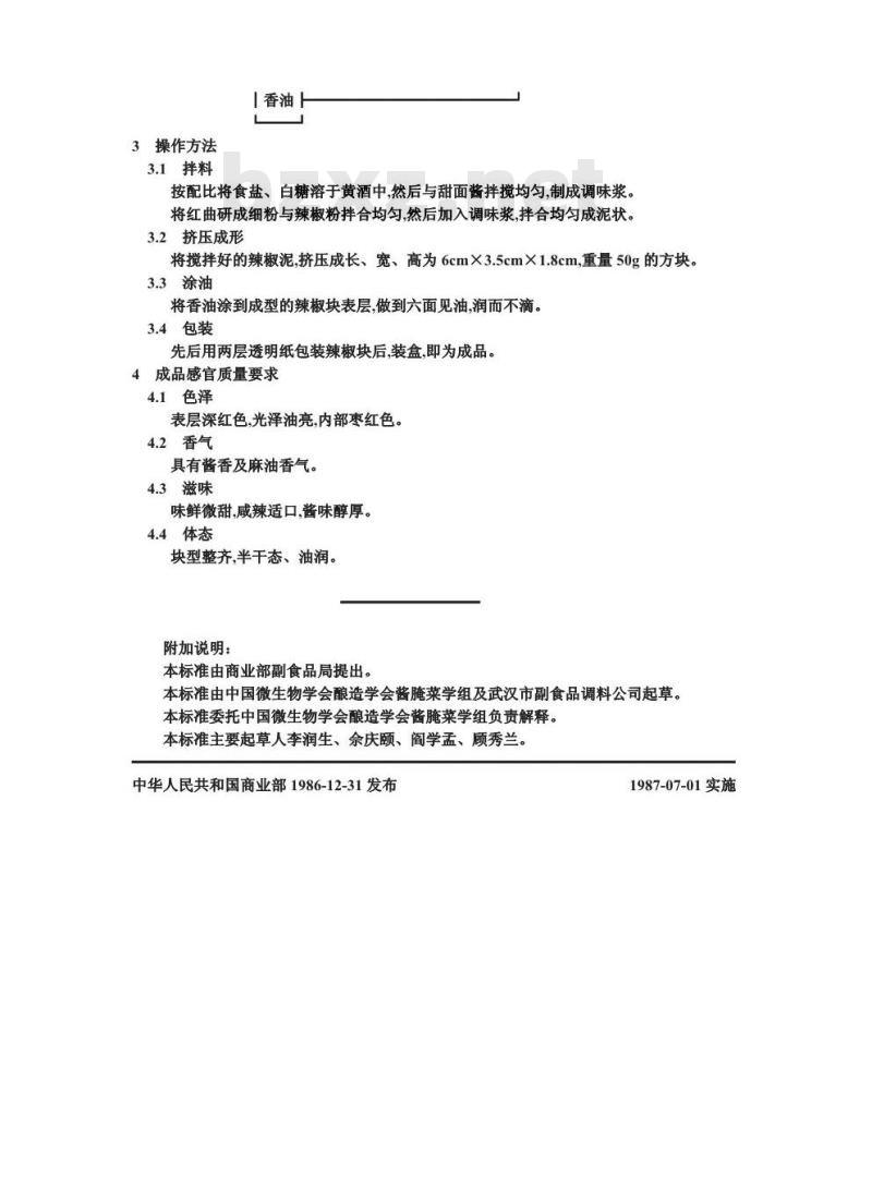 本标准由商业部副食品局提出。本标准由中国微生物学会酿造学会酱腌菜学组及武汉市副食品调料公司起草。本标准委托中国微生物学会酿造学会酱腌菜学组负责解释。本标准主要起草人李润生、余庆颐、阁学孟、顾秀兰。中华人民共和国商业部1986-12-31发布1987-07-01实施