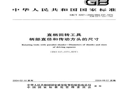 GB/T 4267—2004/ISO·237:1975直柄回转工具柄部直径和传动方头的尺寸本标准规定了直柄回转工具(如铰刀、丝锥等)的柄部直径和传动方头的尺寸。本标准包括两个尺寸系列:第一系列和第二系列。每个系列都列出了以毫米为单位的尺寸及相当的英制尺寸。