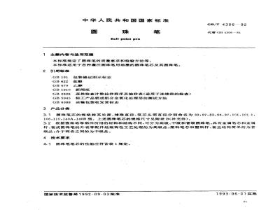 本标准规定了圆珠笔的质量要求和检验方法等。本标准适用于各种灌注圆珠笔用油墨的圆珠笔芯及其圆珠笔。 GB/T 4306-1992 圆珠笔 GB/T4306-1992 标准下载解压密码:www.bzxz.net