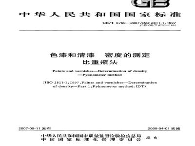 GB/T6750—2007/IS02811-1:1997本标准等同采用ISO2811-1:1997色漆和清漆密度的测定第1部分:比重瓶法》(英文版)。本标准代替GB/T6750—1986《色漆和清漆密度的测定》。本标准与前版GB/T6750—1986的主要技术差异为:一前版系等效采用ISO28111974;本标准规定了标准试验温度,增加了非标准试验温度时密度的计算方式;明确规定了金属比重瓶的容积,玻璃比重瓶的容积由20mL~100mL改为10mL~100mL;一改变了天平精确度的要求;