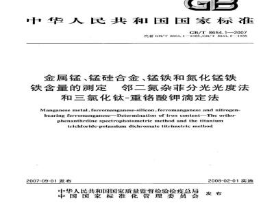 GB/T8654的本部分包括了邻二氮杂菲分光光度法和三氯化钛-重酸钾滴定法两个测定金属锰、锰硅合金、锰铁和氮化锰铁中铁含量的分析方法。本部分代替GB/T8654.1—1988《金属锰化学分析方法邻二氮杂菲光度法测定铁量》和GB/T8654.2一1988《金属锰化学分析方法三氯化钛-重铬酸钾容量法测定铁量》。本部分与GB/T8654.1—1988和GB/T8654.2--1988比较,其主要变化如下:方法适用范围由金属锰扩展到金属锰、锰硅合金、锰铁和氮化锰铁;增加了锰硅合金、锰铁和氮化锰铁试样的分解方法;测定范围由分光光度法0.001%~0.31%和滴定法1.00%~5.00%调整为分光光度法0.001%~1.00%和滴定法1.00%~35.00%;金属锰试样粒度由通过0.177mm筛孔调整为通过0.149mm筛孔。本部分由中国钢铁工业协会提出。本部分由冶金工业信息标准研究院归口。本部分起草单位:四川川投峨眉铁合金(集团)有限责任公司。本部分主要起草人:唐华应、方艳、蒲海燕。本部分所代替标准的历次版本发布情况为:-GB/T8654.1—1988;