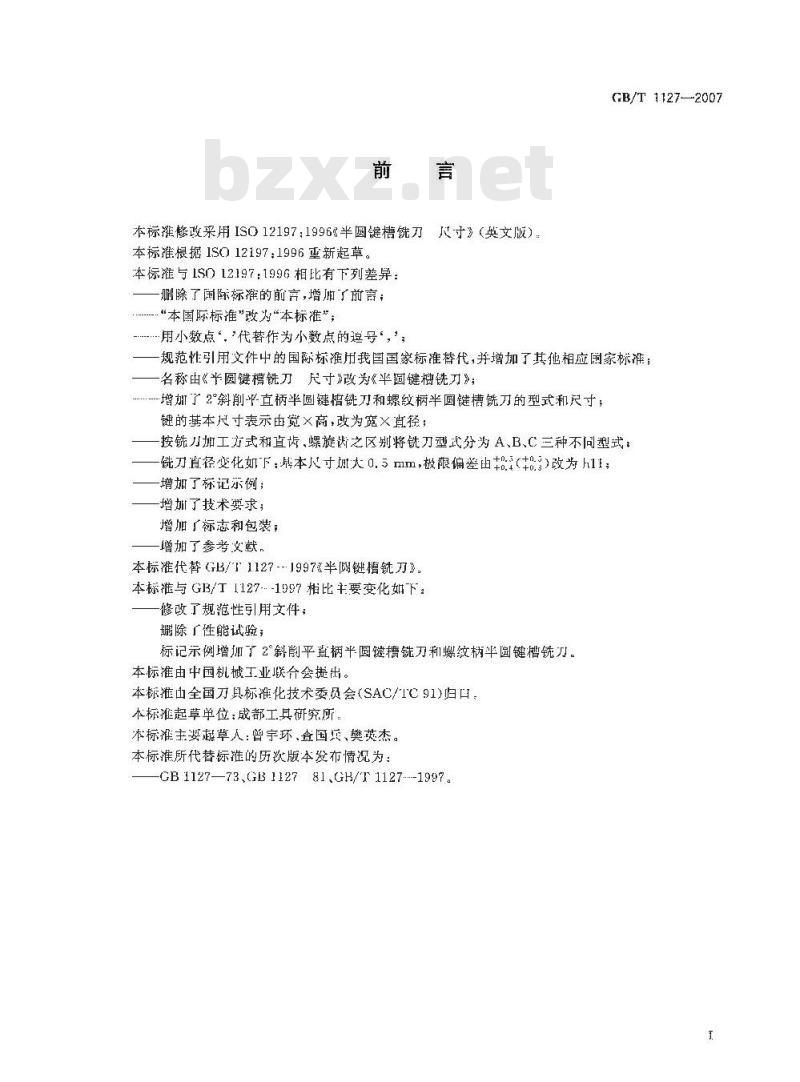 标记示例增加了2°斜削平直柄平圆镗槽铣刀和螺纹柄平圆键槽铣刀。本标准由中国机械工业联合会提出。本标准山全国刀具标准化技术委员会(SAC/TC91)归口:本标雅起草单位:成都工具研究所:本标雅主婆起草人:曾宇环、查国乒、樊英杰。本标准所代替标准的历次版本发布情况为:GB 1127—73,GB 112781,GB/F 1127..-1997范围