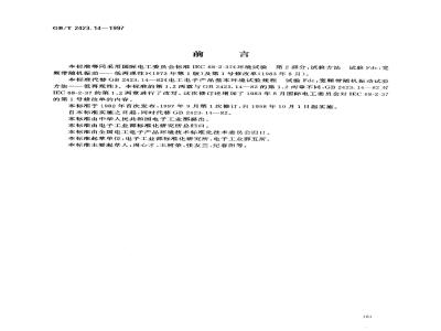 本标准于1982年首次发布,1997年9月第1次修订,自1998年10月1日起实施。自本标准实施之日起,同时代替GB2423.14--82。本标准由中华人民共和国电子工业部提出。本标准由电子工业部标准化研究所总归口。本标准由全国电工电子产品环境技术标准化技术委员会归口。本标准起草单位:电子工业部标准化研究所、电子工业部五所。本标准主要起草人:周心才、王树荣、张友兰、纪春阳等。181