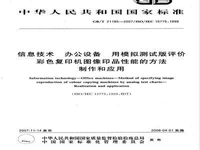 GB/T21185—2007/IS0/IEC15775:1999信息技术办公设备用模拟测试版评价彩色复印机图像印品性能的方法制作和应用
