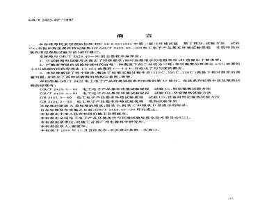 GB/T2423.3一93电工电子产品基本环境试验规程试验Ca:恒定湿热试验方法GB/T2423.4一93电工电子产品基本环境试验规程试验Db:交变湿热试验方法GB2423.9-89电工电子产品基本环境试验规程试验Cb:设备用恒定湿热试验方法GB2424.2-93电工电子产品基本环境试验规程湿热试验导则本标准的附录A是标准的附录,附录B、附录C和附录D是提示的附录。自本标准发布实施之日起,GB/T2423.40-90即行废止。本标准由中华人民共和国机械工业部提出。本标推由全国电工电子产品环境条件与环境试验标准化技术委员会归口。本标准起草单位:机械工业部广州电器科学研究所。本标雅起草人:谢建华。