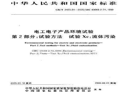 Environmental tcsting for clcctric and clcetronic pradncts-Part 2:Test methods-Test Xc:Fluid contamination(IEC 60068-2-74:1999.Environmcntal testingPart 2, Tests-Test Xc:Fluid contamination,ID'l)2005-01-18发布