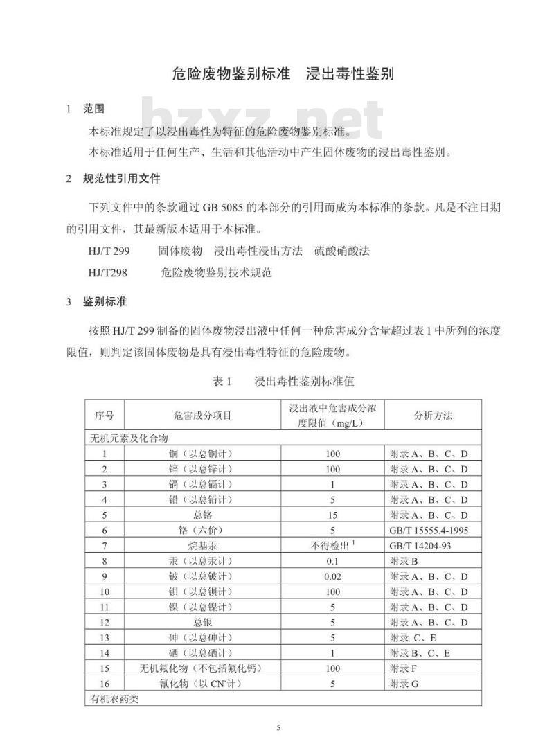 危险废物鉴别标准浸出毒性鉴别本标准规定了以浸出毒性为特征的危险废物鉴别标准。本标准适用于任何生产、生活和其他活动中产生固体废物的浸出毒性鉴别。规范性引用文件