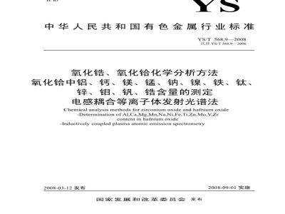 本部分规定了氧化铪中铝、钙、镁、钠、镍、铁、钛、锌、钼、钒、锆含量测定方法。本部分适用于氧化铪中铝、钙、镁、锰、钠、镍、铁、钛、锌、钼、钒、锆含量的测定。 本部分代替YS/T568.9-2006《氧化锆中氧化铪量的测定》(原GB/T2590.9-1981)。本部分与YS/T568.9-2006相比主要变化如下:---改变了测定方法;---增加了测定元素;---增加了7.1 重复性条款;---增加了8 质量保证与控制条款。 YS/T 568.9-2008 氧化锆、氧化铪化学分析方法 氧化铪中铝、钙、镁、锰、钠、镍、铁、钛、锌、钼、钒、锆量的测定 电感耦合等离子体发射光谱法 YS/T568.9-2008