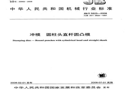 本标准代替JB/T5825—1991《冲模—圆柱头直杆圆凸模》。本标准与JB/T5825—1991相比,主要变化如下:将标准名称改为《冲模圆柱头直杆圆凸模》;一增加了“前言”和“规范性引用文件”一材料和硬度改为推荐选用,取消了“T10A、9Mn2V”增加了“5要求”一章;