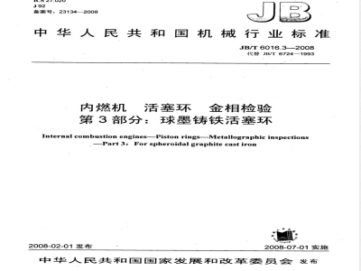 JB/T6290—2007内燃机筒体铸造活塞环金相检验;JB/T9745一1999内燃机硼铸铁单体铸造活塞环金相检验。本部分由中国机械工业联合会提出。本部分由全国内燃机标准化技术委员会(SAC/TC177)归口。本部分起草单位:上海内燃机研究所、安庆帝伯格茨活塞环有限公司、仪征双环活塞环有限公司、石家庄金刚内燃机零部件集团有限公司。本部分主要起草人:崔晓蕾、王星、林祥华、刘津东、苏晴华。本部分所代替标准的历次版本发布情况:-JB/T6724—1993。