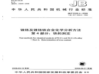 JB/T6326的本部分规定了用磺基水杨酸光度法测定镍铬及镍铬铁合金铁含量的试剂、分析程序分析结果计算和精密度等内容。本部分适用于镍铬及镍铬铁合金中铁含量的测定。测定范围:0.10%~1.00%。2方法提要