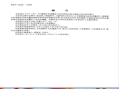 本标准对GB/T2460-81《硫铁矿和硫精矿分析试样的采取及制备方法》进行修订。本标准在修订过程中,经过深入调查研究,大量资料分析对比,认为前版规定的采样量较大。根据国外标准确定采样总的原则和原采样实验验证结果,参考其他化学矿采样参数,对前版规定的采样总量和每点采取的份样量作了适当的调整。对测定水分用样品的制备方法等也作了必要的修改。本标准自生效之日起,代替GB/T2460--81。本标准由中华人民共和国化学工业部提出。本标准由化学工业部化工矿山设计研究院归口。本标准负责起草单位:化学工业部化工矿山设计研究院。本标准参加起草单位:云浮硫铁矿企业集团公司、南化公司研究院、大田硫铁矿、川化集团公司、湛化企业集团公司等。
