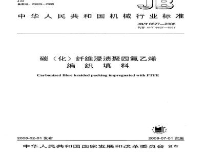本标准代替JB/T66271993《碳(化)纤维浸渍聚四氟乙烯编织填料》。本标准与JB/T6627-1993相比,主要变化如下:检验规则不再按GB/T2828执行;产品的填充材料中取消了石棉纤维。本标准由中国机械工业联合会提出。本标准由机械工业填料静密封标准化技术委员会归口。本标准起草单位:合肥通用机电产品检测院。本标准主要起草人:杨书益、王培洲、熊微。本标准所代替标准的历次版本发布情况:-JB/T6627—1993。