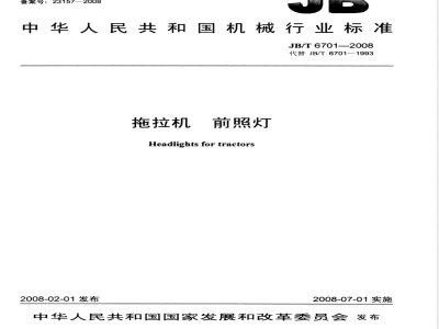 一一取消引用标准GB/T1729及相应的5.1.1。—引用最新标准GB/T20949—2007代替GB4785。一增加引用标准GB7258及相应的5.4。一增加引用标准GB4599及相应的5.7.4。一在范围中增加安装的规定及相应的第4章。本标准由中国机械工业联合会提出。本标准由全国拖拉机标准化技术委员会(SAC/TC140)归口。本标准负责起草单位:国家拖拉机质量监督检验中心本标准主要起草人:李京忠、刘惠、柳玲文、高波。本标准所代替标准的历次版本发布情况:-JB/T6701--1993。