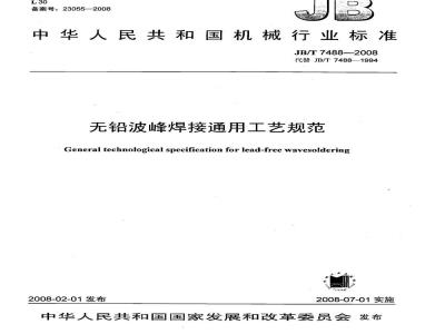 本标准代替JB/T7488—1994《波峰焊工艺规范》。与JB/T7488—1994相比,主要变化如下:一对于无铅波峰焊接的设备、无铅焊料、印制电路板以及元器件的无铅要求,无铅焊接的工艺控制和质量控制的原则和方法,以及无铅焊点的质量评价标准和检验方法进行了较为详细的补充和修改。