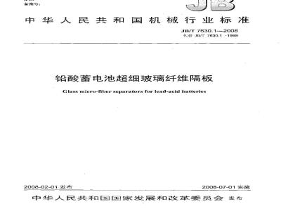 JB厅7630《铅酸蓄电池隔板》分为五个部分:-·铅酸蓄电池超细玻璃纤维隔板;一铅酸蓄电池微孔橡胶隔板;