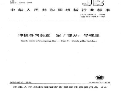 JB/T7645的本部分规定了冲模导向装置导柱座的尺寸规格和标记。本部分适用于冲模导柱座。