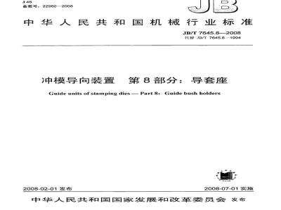 JB/T7645的本部分规定了冲模导向装置导套座的尺寸规格和标记。本部分适用于冲模导套座。