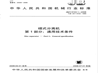 JB/T8103《碟式分离机》包括以下七个部分:第1部分:通用技术条件;