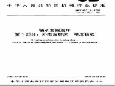 JB/T4071《轴承套圈磨床》分为四个部分:第1部分:外表面磨床精度检验;-第2部分:内表面磨床精度检验;一第3部分:技术条件;