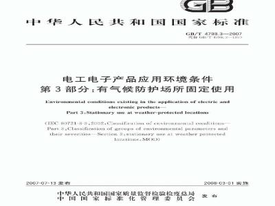 本部分为GB/T4798.3-2007,修改采用IEC60721-3-3:2002《环境条件分类 第3部分:环境参数组分类及其严酷程度分级 第3节:有气候防护场所固定使用》(英文版)。