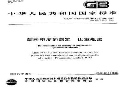 GB/T 1713—2D08/ISO 787-10,1993本标准等同采用1S0787-10:193°额料租体质额料通用试验方法第10部分:密度的测定比重瓶法义英文版)。